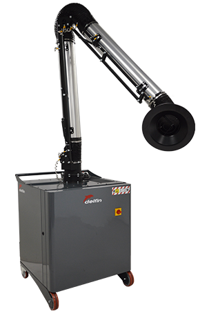 Depolverazione industriale con bracci articolati per aspirazione localizzata su banchi di lavoro. Elevata portata d'aria, ampi filtri in poliestere, pulizia dei filtri integrata e grande capacità di raccolta.